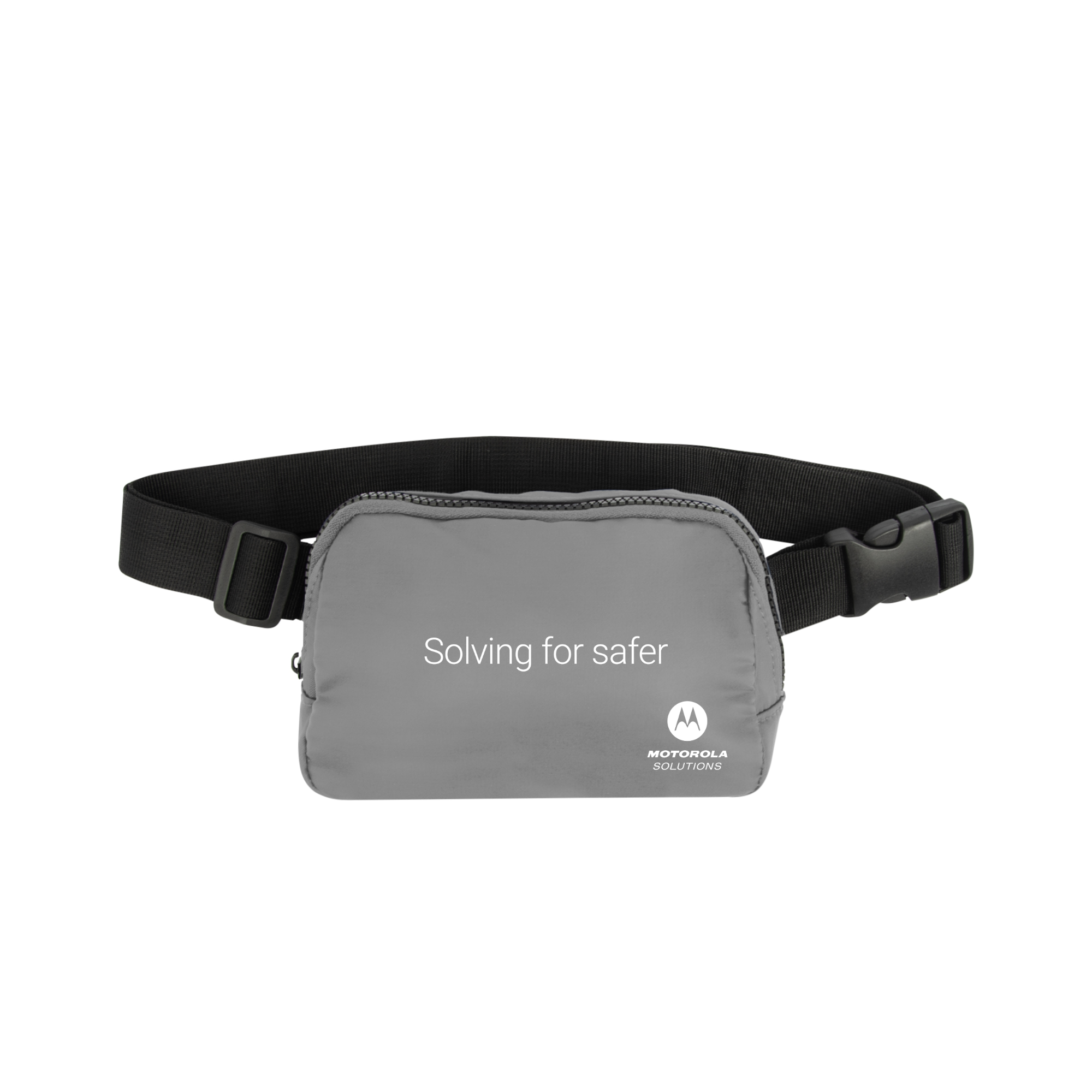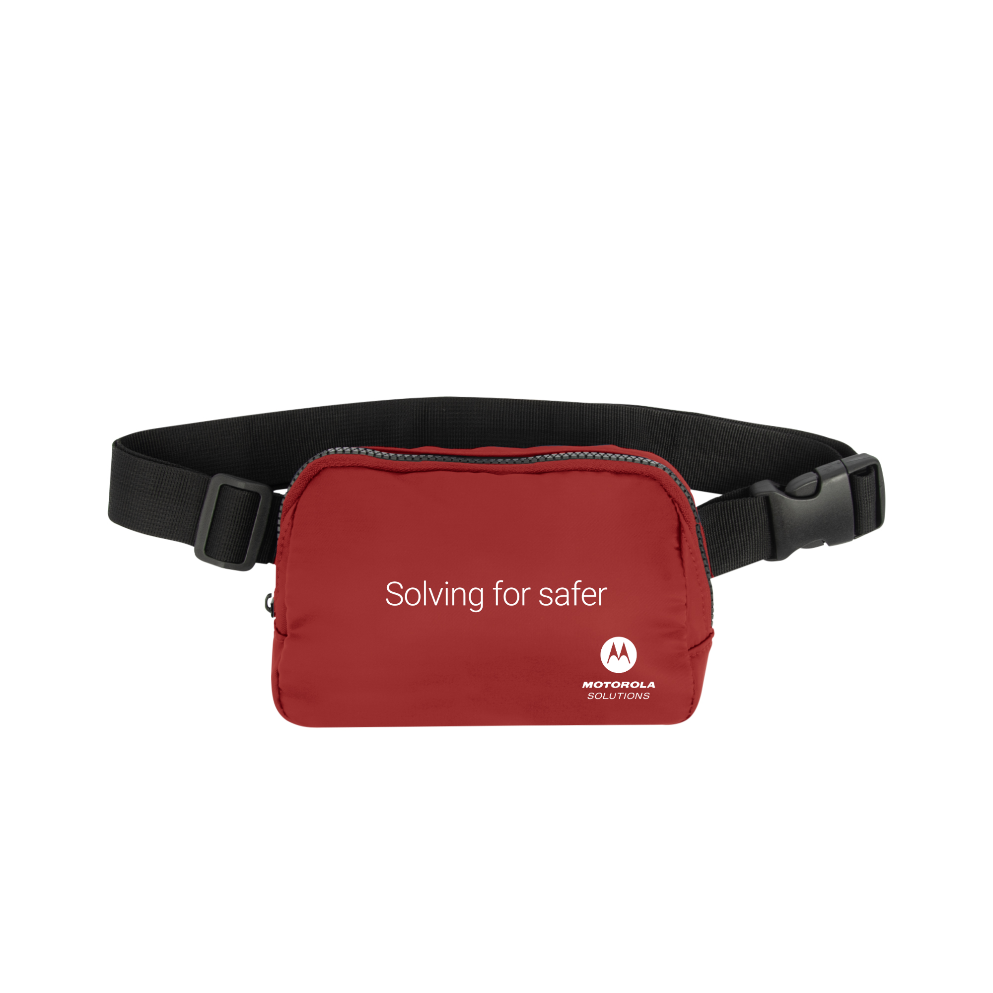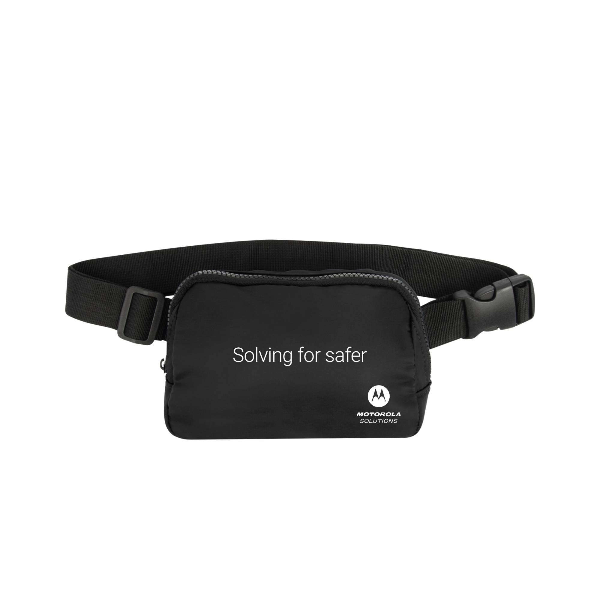Belt bag that can be worn as a fanny pack or as a chest sling. Made of a combo of polyester & polyester lining. Has a zippered main compartment and a back zippered pocket. Features and adjustable waist strap. Spot clean/air dry only. Imprinted with both the Solving for Safer horizontal logo and the Motorola Solutions vertical logo.