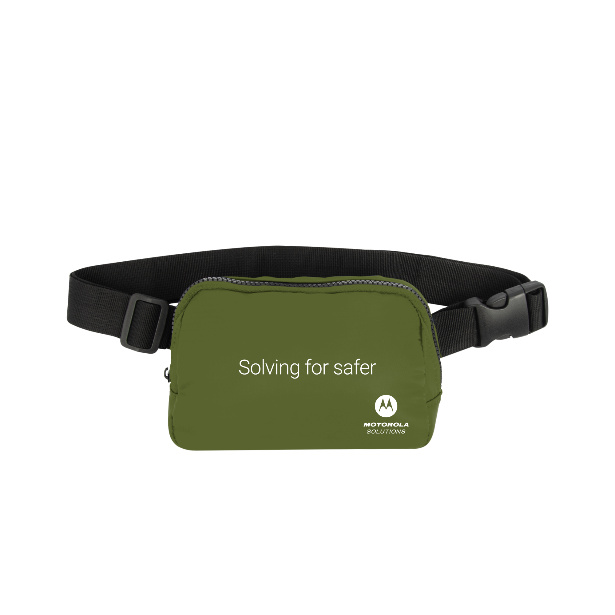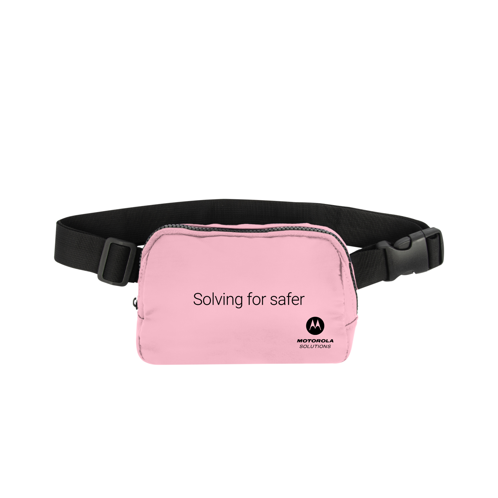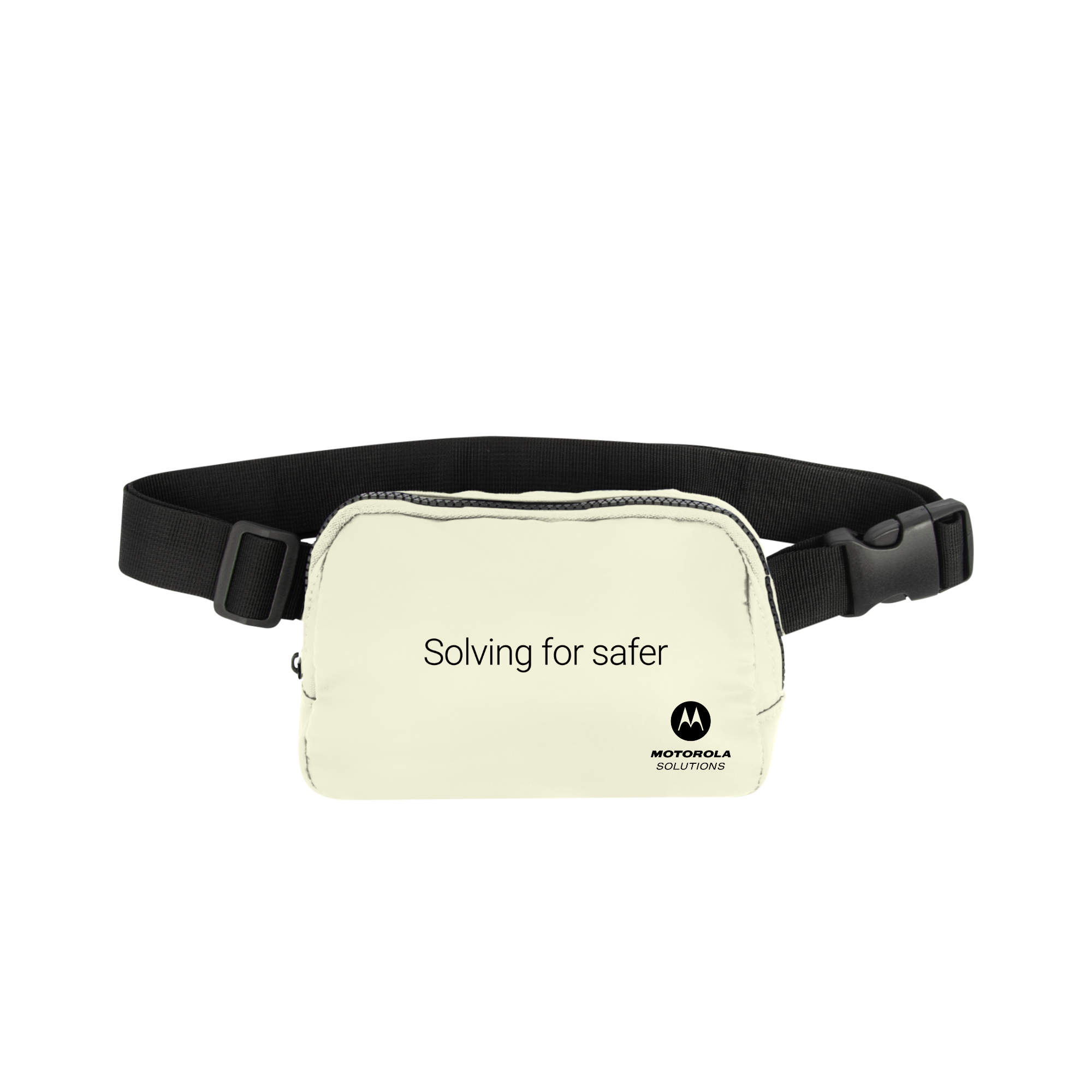 Belt bag that can be worn as a fanny pack or as a chest sling. Made of a combo of polyester & polyester lining. Has a zippered main compartment and a back zippered pocket. Features and adjustable waist strap. Spot clean/air dry only. Imprinted with both the Solving for Safer horizontal logo and the Motorola Solutions vertical logo.