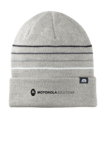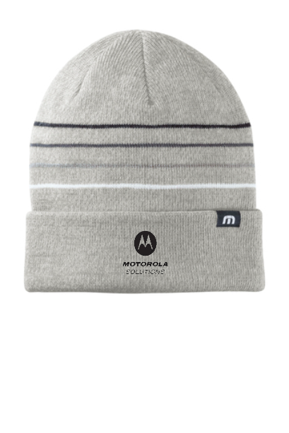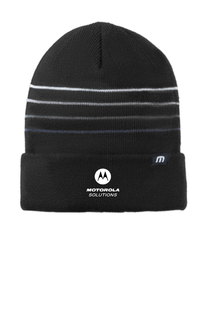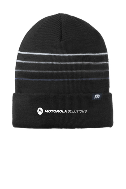 Stay a step ahead and count on this striped beanie for an elevated look and ultimate comfort. 100% acrylic. Tearaway label. Darts at crown for shaping. Adjustable cuff height for a personalized fit. TM woven label at left cuff. Embroidered with the Motorola Solutions logo.