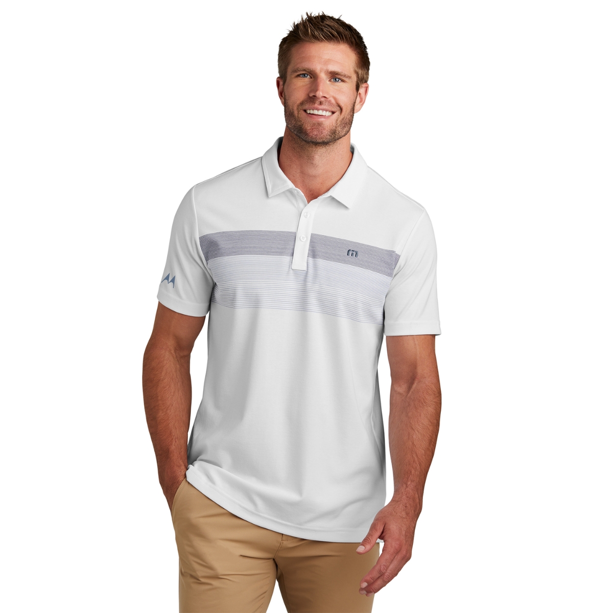 Make a bold statement with the TravisMathew Coastal Chest Stripe Polo, designed for both style and performance. This 4.4-ounce blend of cotton and polyester offers a wrinkle-resistant, quick-drying fabric with 4-way stretch for ultimate comfort and flexibility. The large-scale chest stripe, overlaid with texture, adds a distinctive touch, while the self-fabric collar and three-button placket with dyed-to-match buttons maintain a polished look. With an embroidered TM logo on the left chest, open hem sleeves, and side vents, this polo combines easy-care convenience with sophisticated style. Perfect for both casual and active occasions. Features the Motorola M on the right sleeve.