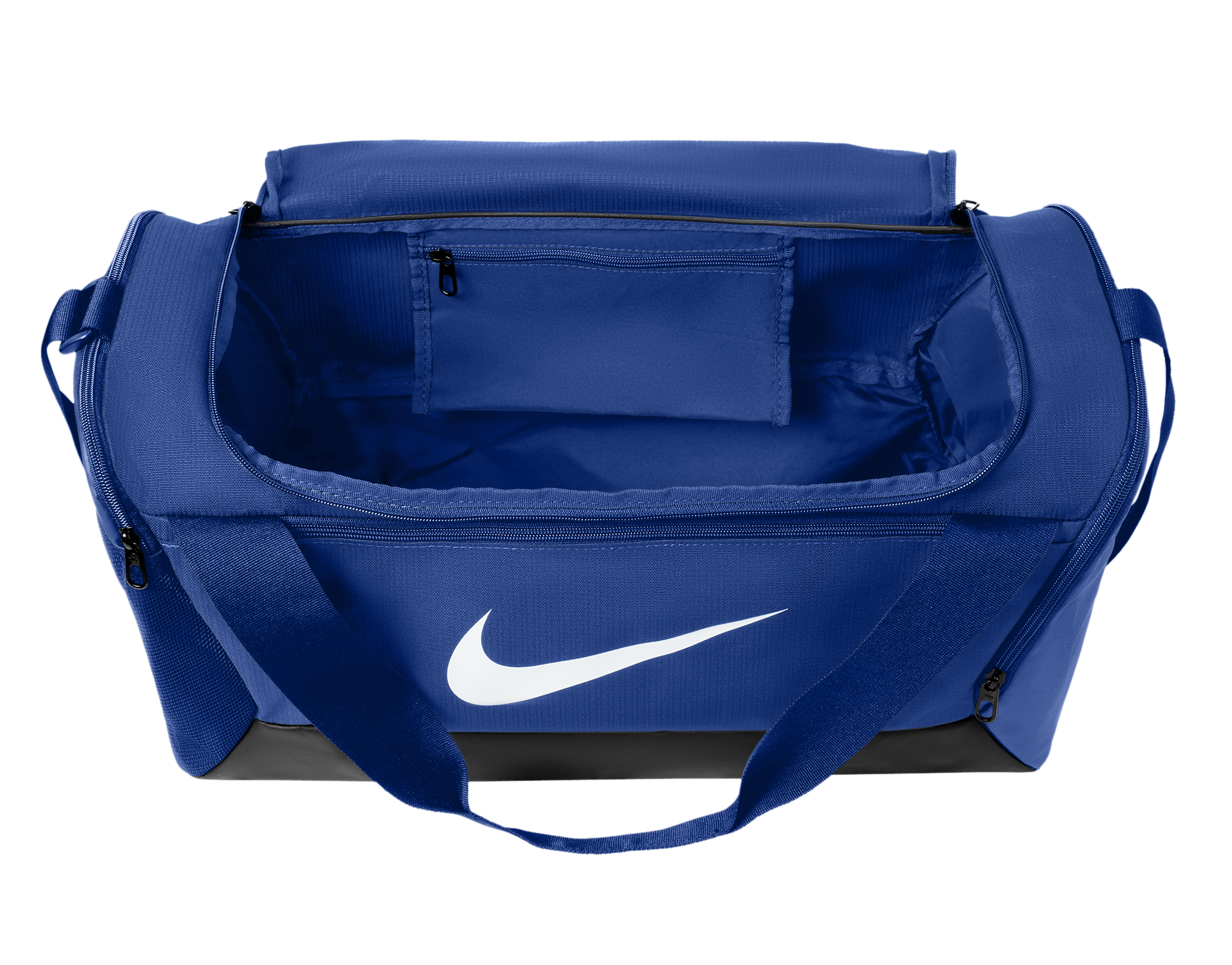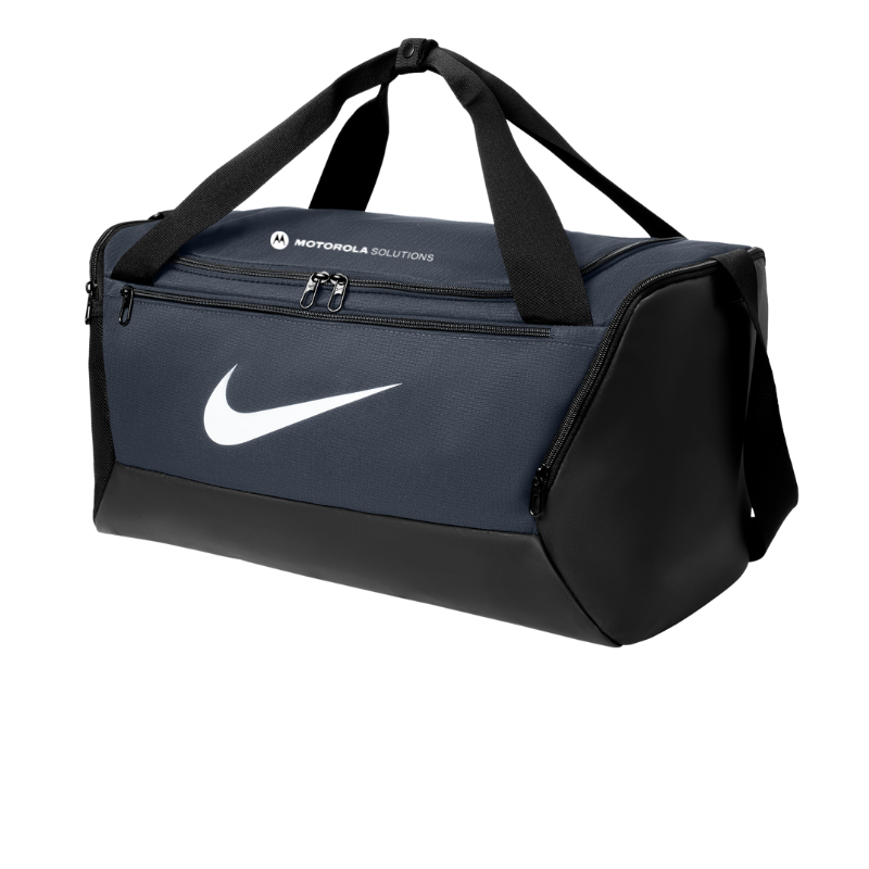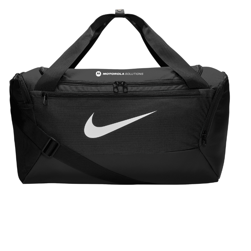 This versatile Nike duffel bag is made from 100% recycled polyester dobby and features a dual-zip main compartment for secure and spacious storage. It includes a separate shoe compartment to keep your footwear separate from other gear, as well as an exterior zippered pocket for easy access to essentials and an interior zippered pocket for valuables. The bag offers multiple carrying options with both double handles and a shoulder strap for convenience. A contrast Swoosh design trademark adds a touch of style. With dimensions of 20"l x 11"w x 11"h and approximately 2,503 cubic inches of space, it's the perfect companion from the gym to the office and beyond. Features the Motorola Solutions logo on top of the bag.
